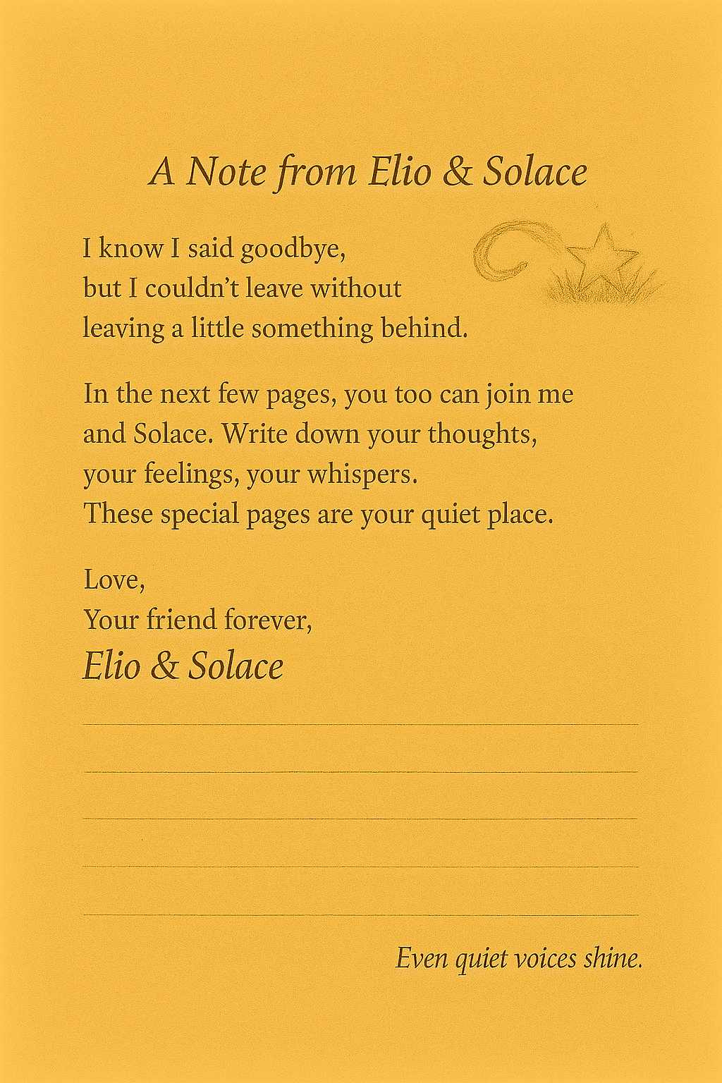 Elio and Solace: Find the Quiet Place is a tender, beautifully illustrated journey into stillness, belonging, and the gentle power of listening to your own heart. When the world feels loud and full of hurry, Elio and his glowing companion, Solace, set out to discover a place where children can breathe, feel, and simply be.